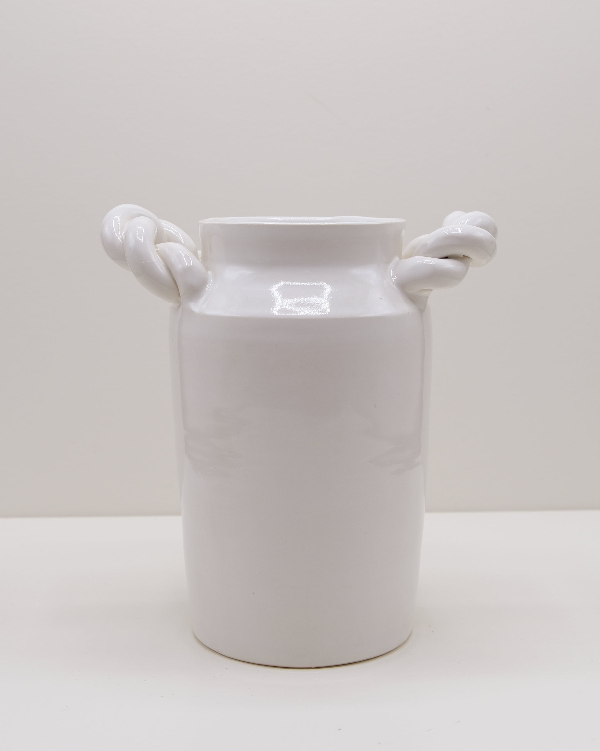 Wheel thrown and hand-built vase made by hand from white stoneware. Finished with a soft white glossy glaze.